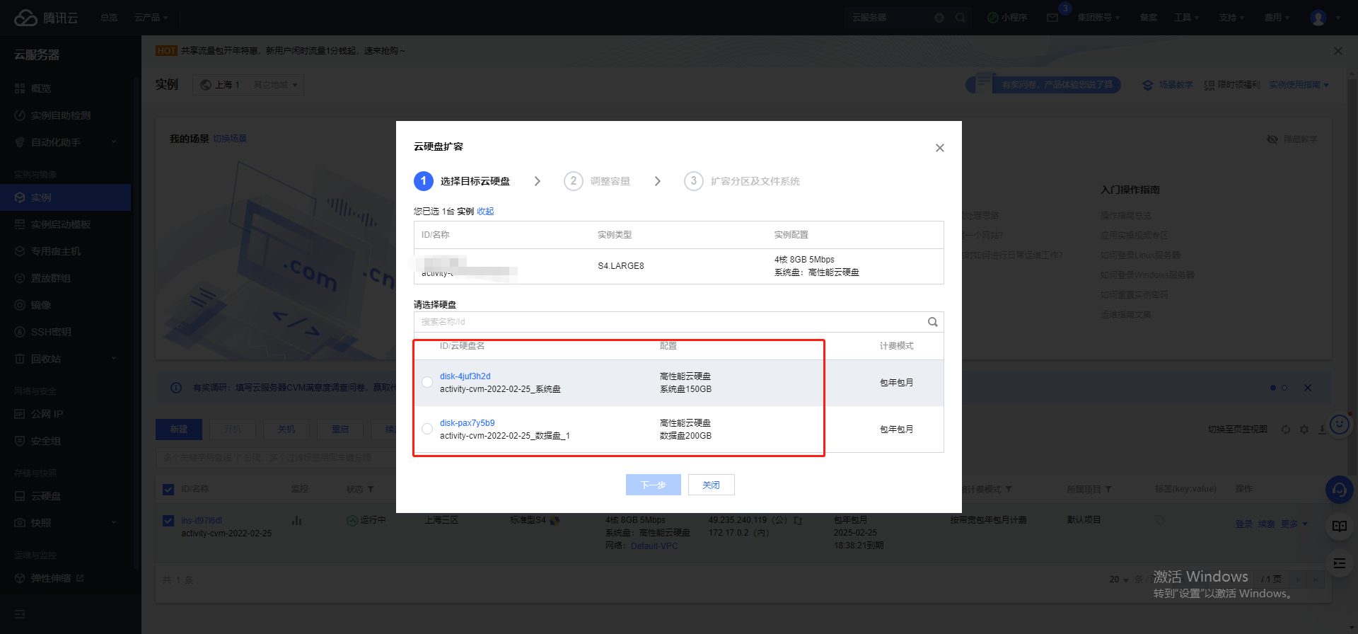 选择需要扩容的盘,选择好扩容容量,点击下一步,确认并购买