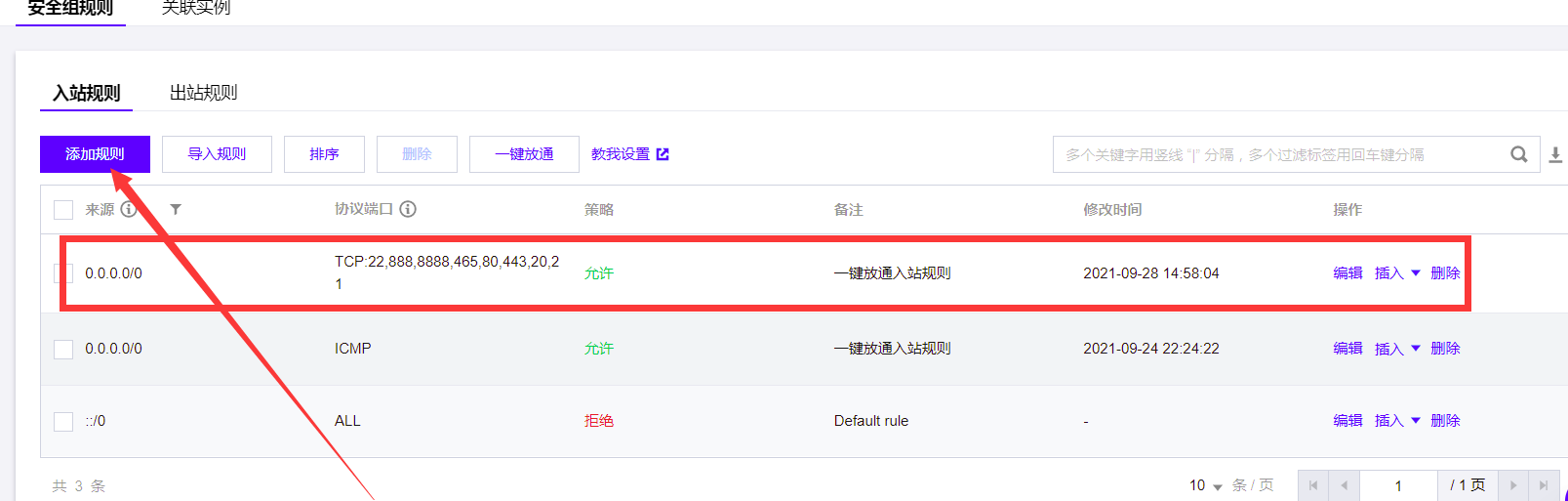 3:服务器安全组开放端口配置:实例-安全组-修改规则:0.0.0.0/0 [TCP:22,888,8888,465,80,443,20,21][TCP:39000-40000]