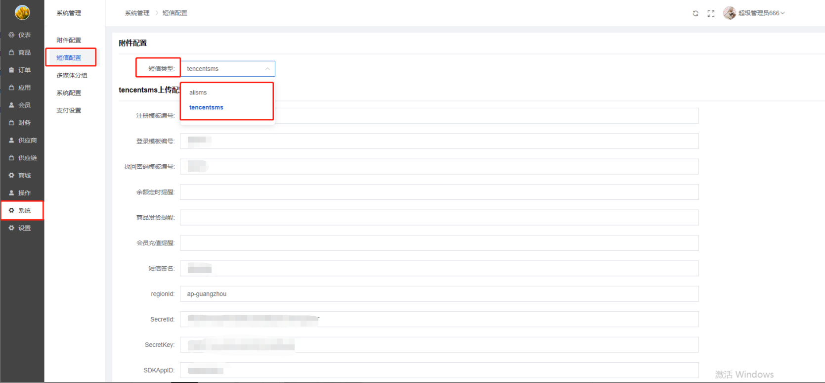 1)腾讯云短信配置时,regionId默认填写ap-guangzhou(阿里云短信也是)、SecretId填写如下说明:
