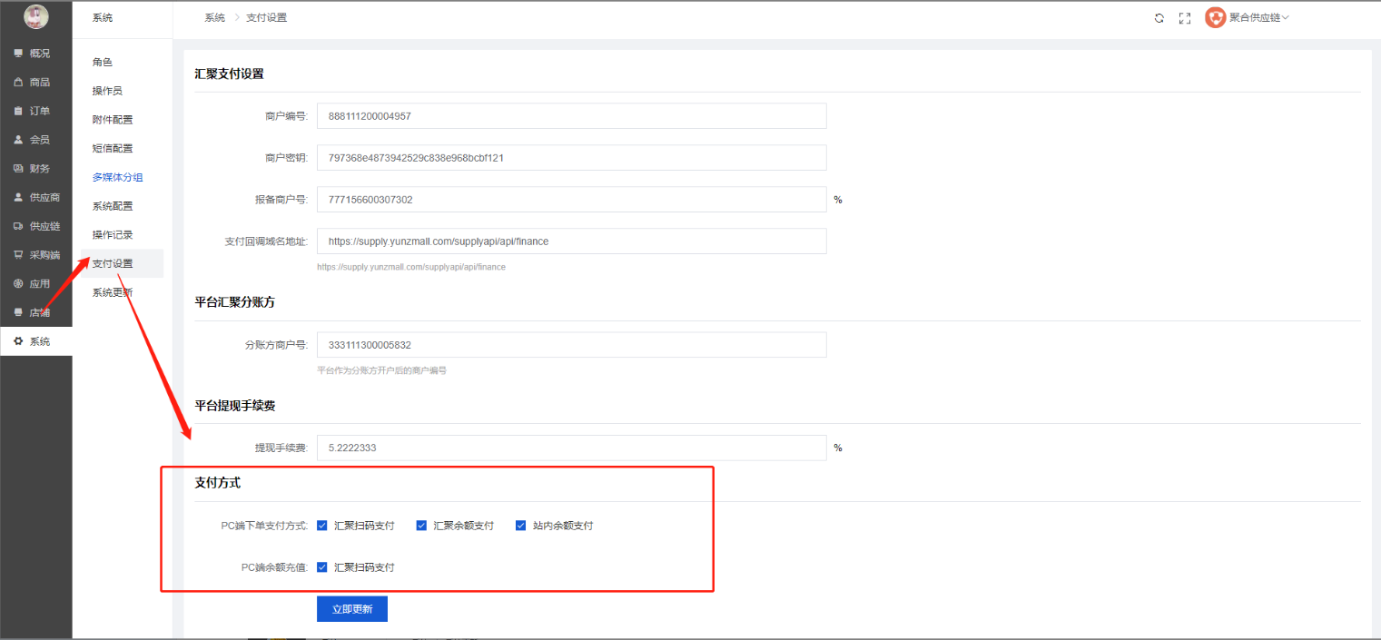注:控制汇聚支付开关的前提是,汇聚支付的所有信息需要配置好,如果没配置 即使开关开了也不会显示。