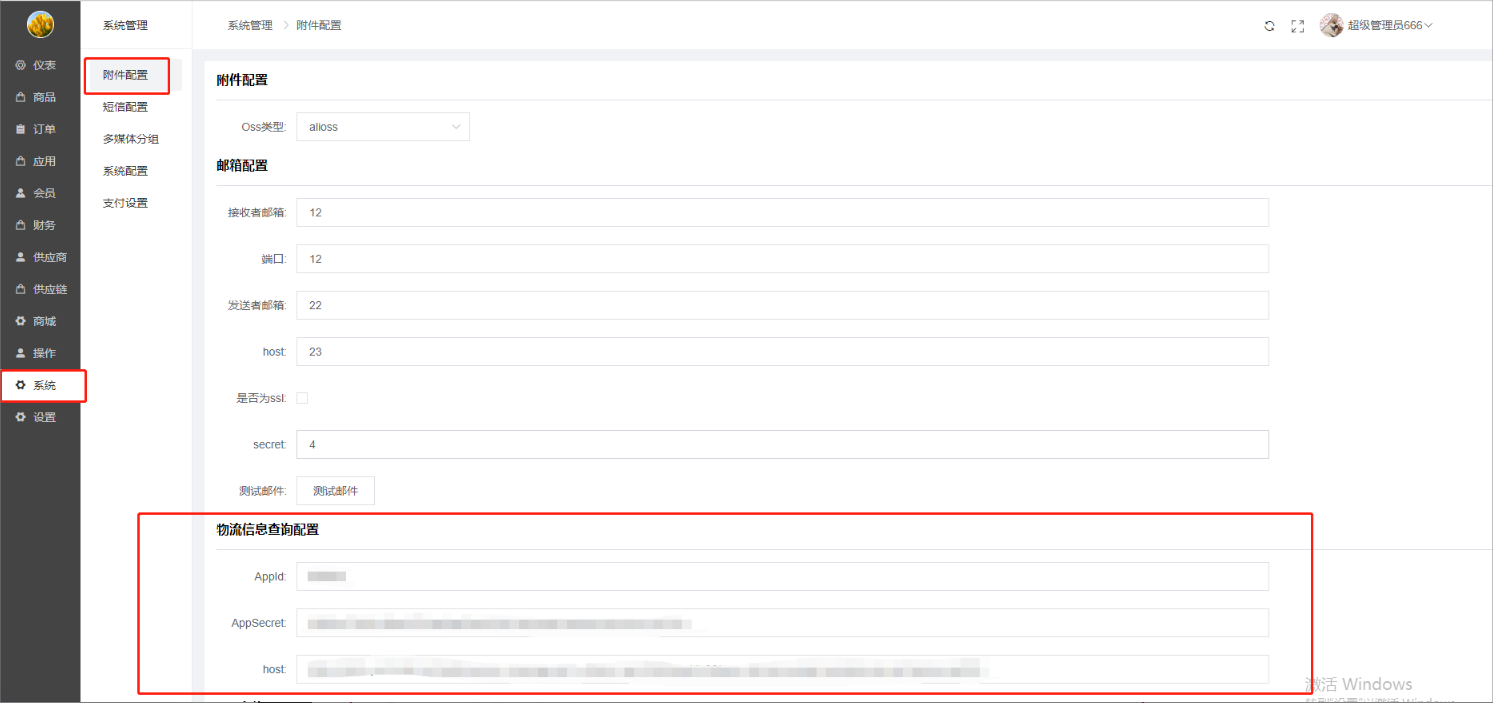 商城查询快递信息接口,需要在后台的“系统-附件配置-物流信息查询配置”中填写相关信息(需要找销售人员帮开通芸签服务,得到配置信息)