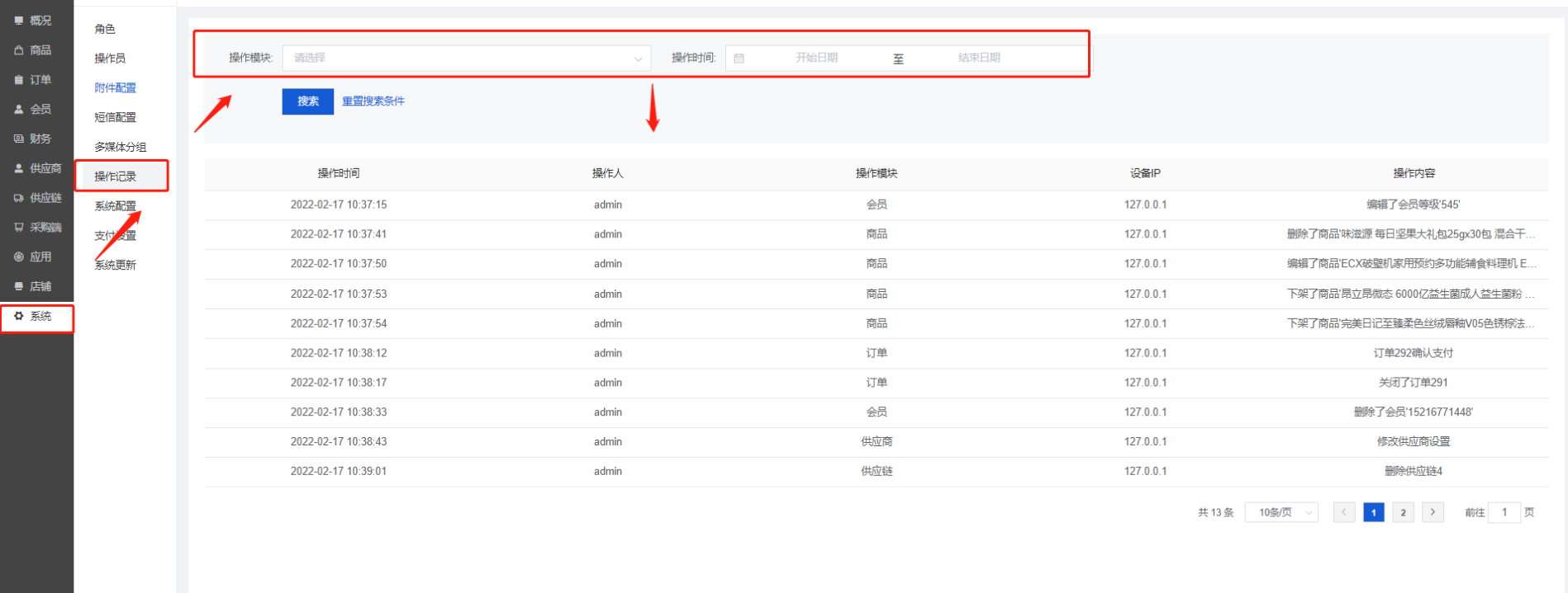 显示中台账号的操作记录,可以按操作操作模块、操作时间搜索查看对应操作记录,记录可以显示操作时间,操作人,操作模块,设备ip,操作内容;
