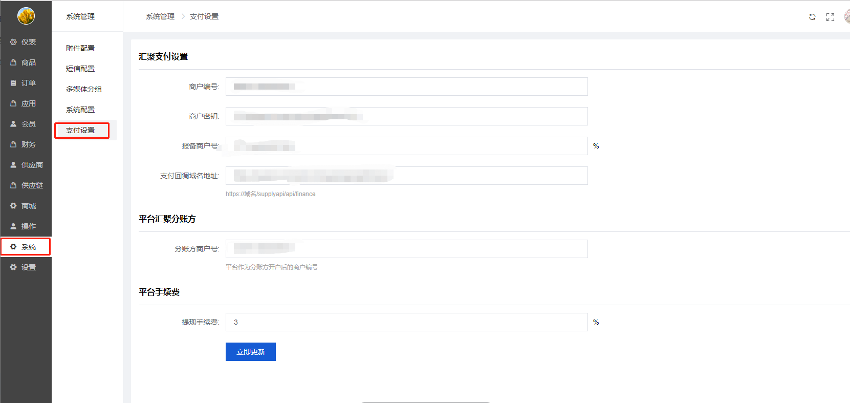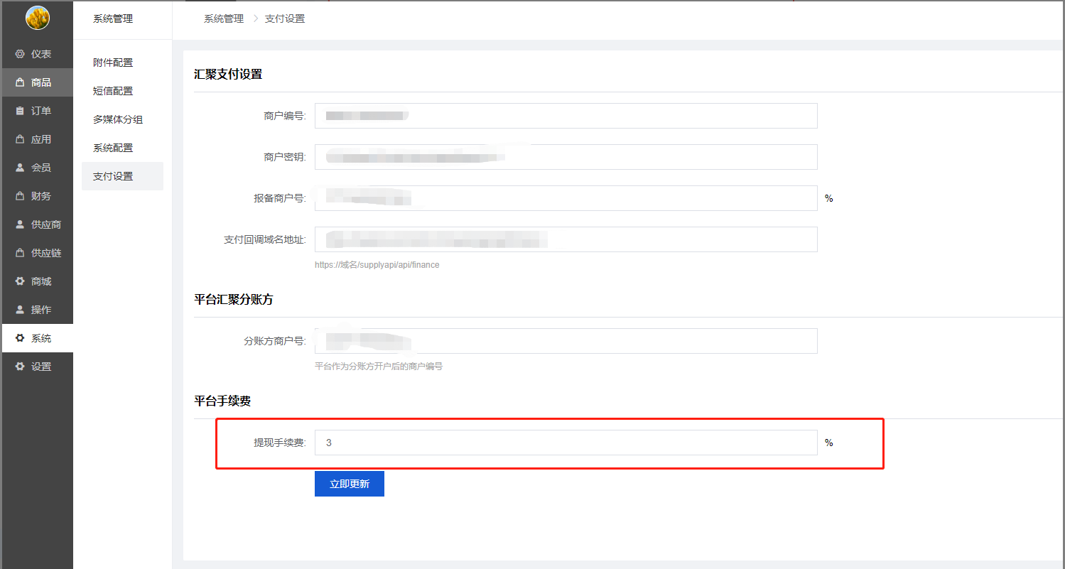 3)平台手续费是给各个供应商分账时所扣除的额外手续费,百分比单位